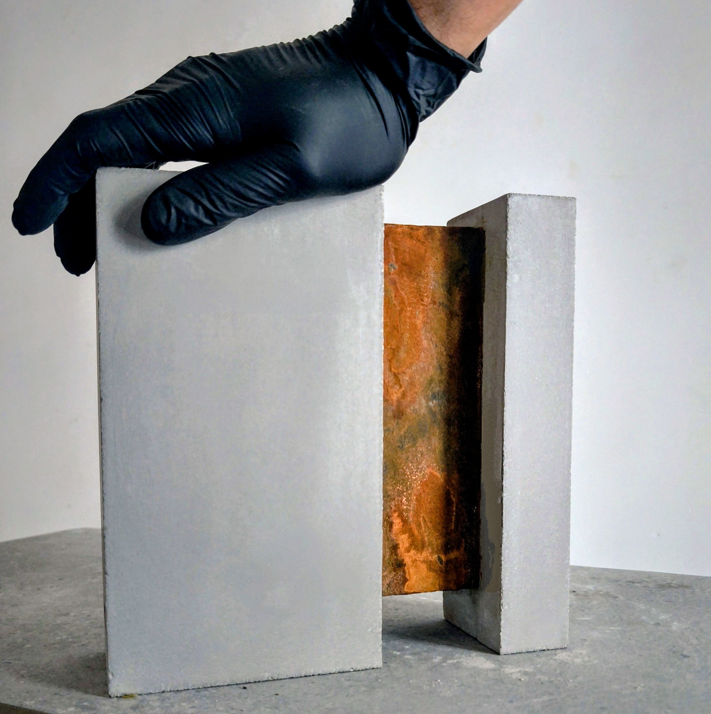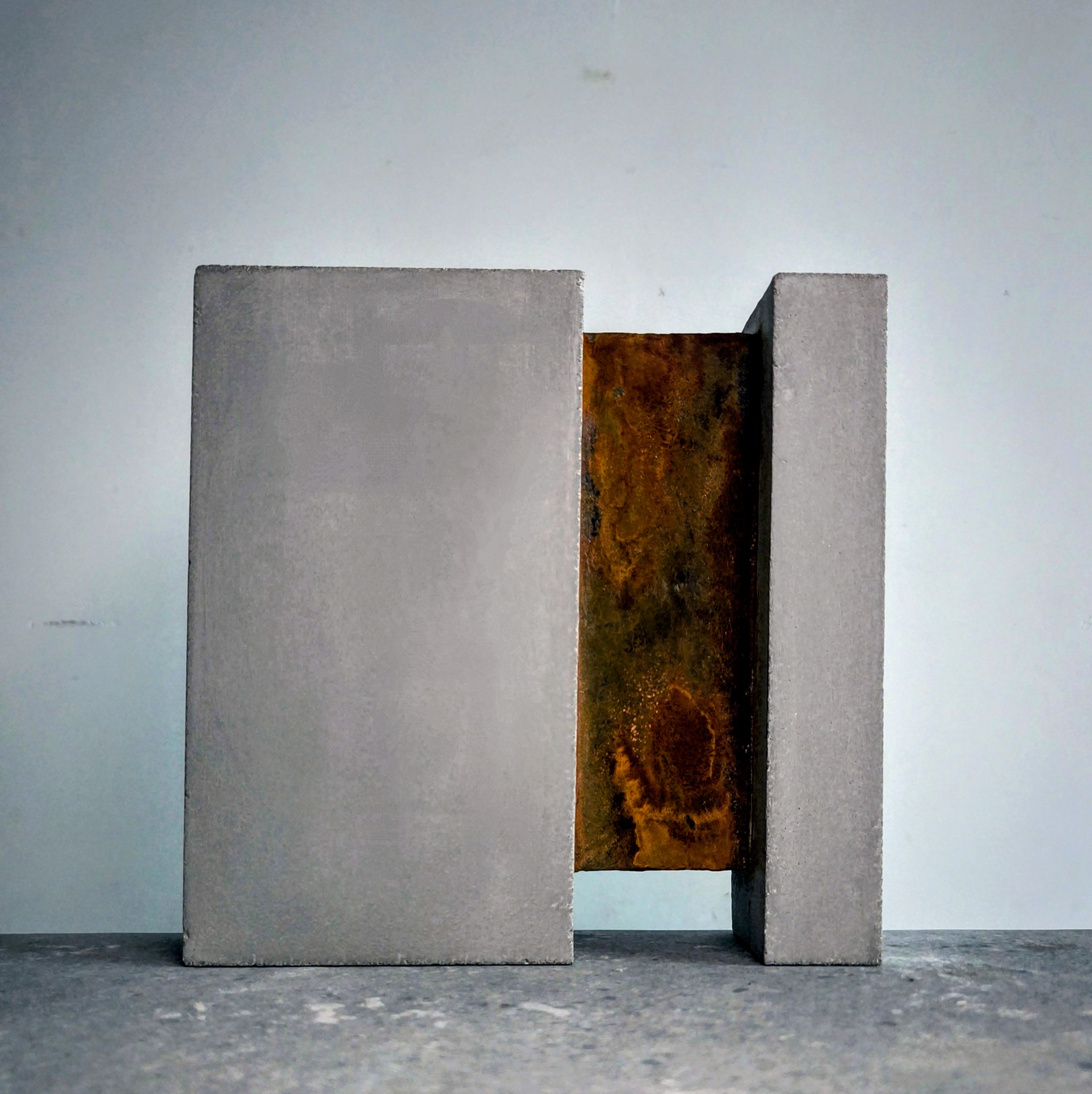 Concrete sculpture treated through a stratified oxidative process — iron particle base and acid activator — generating a chromatic field within the ferrous oxide spectrum.