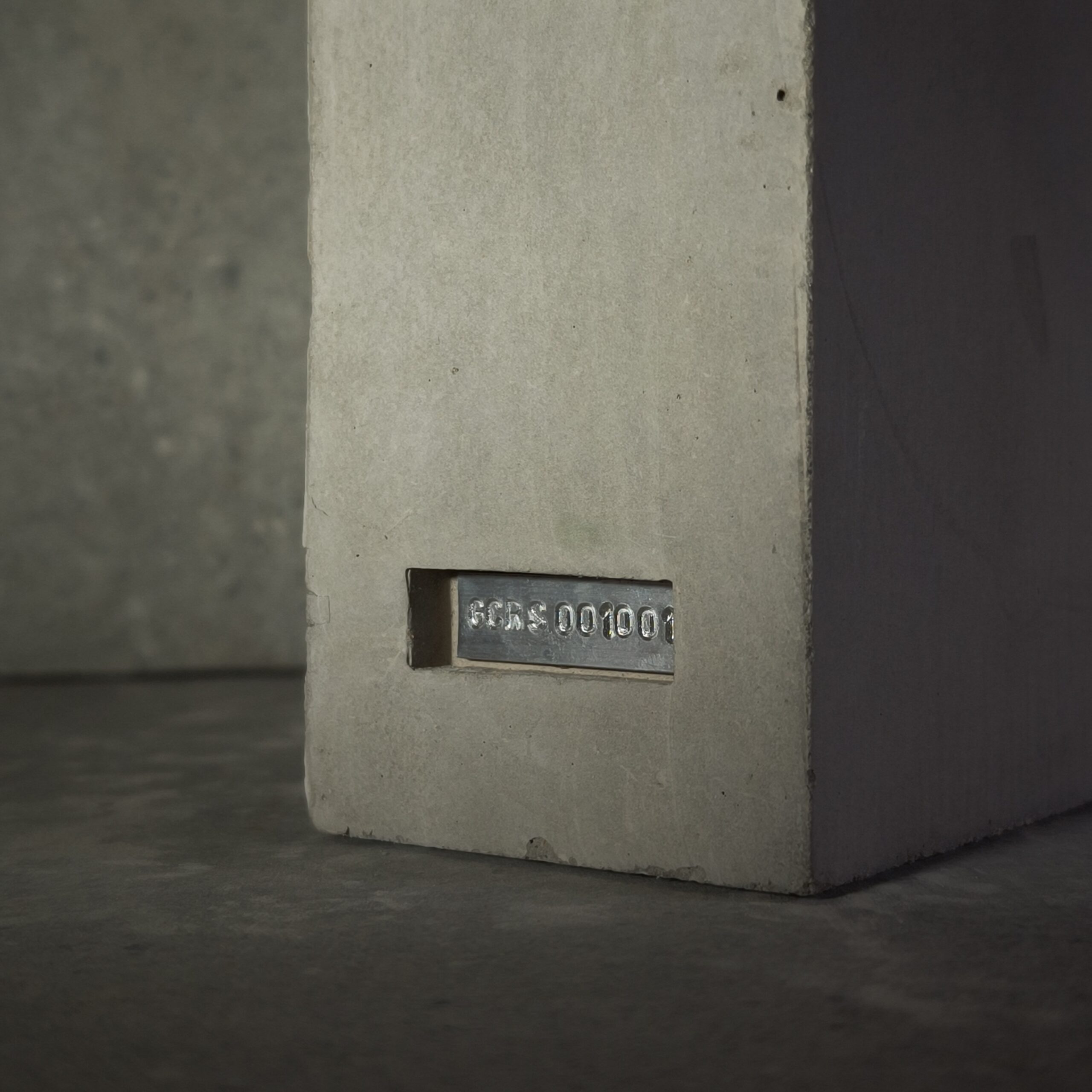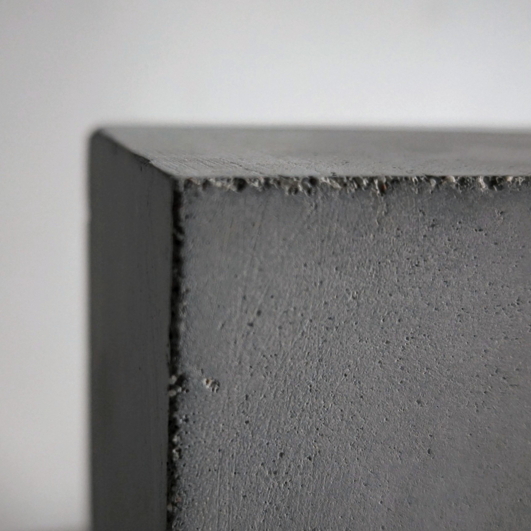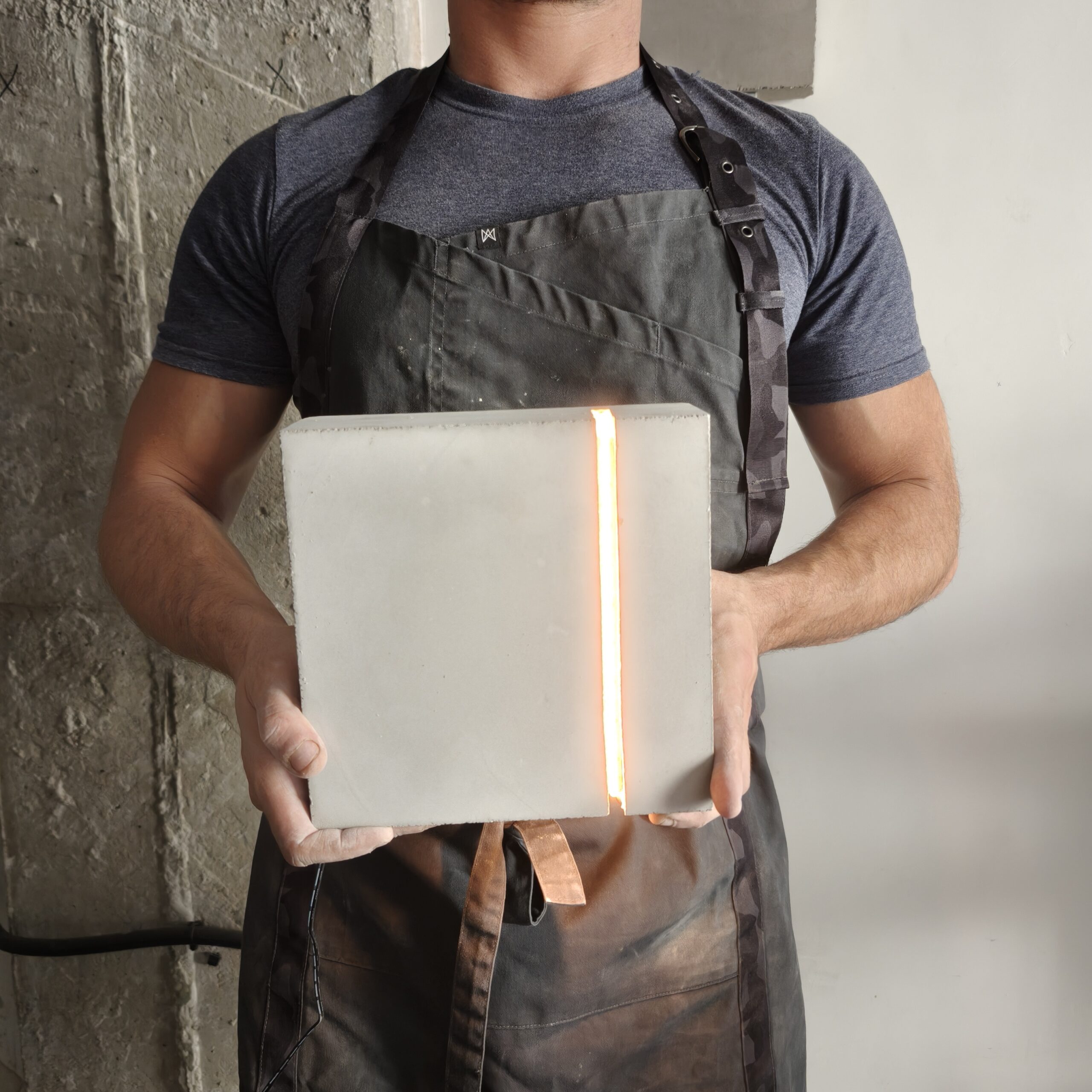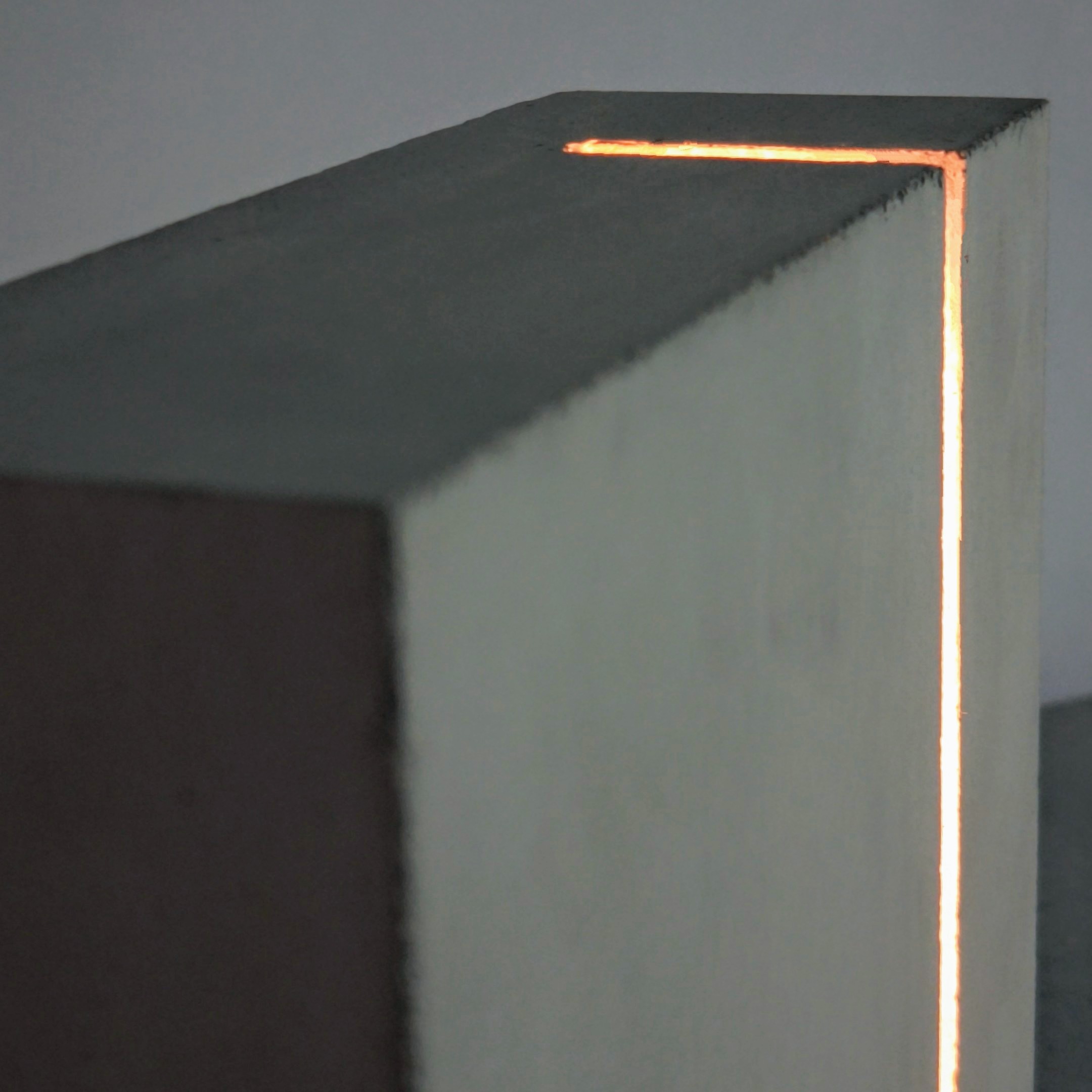 Escultura en hormigón de masa geométrica con iluminación integrada, fraguada en molde de fabricación propia a partir de secciones de EPS cortadas con hilo caliente. Una ranura vertical recorre la cara lateral de la pieza, alojando una tira LED COB de luz cálida en perfil de aluminio. La luz emerge contenida entre la masa y el borde, proyectando hacia el suelo.