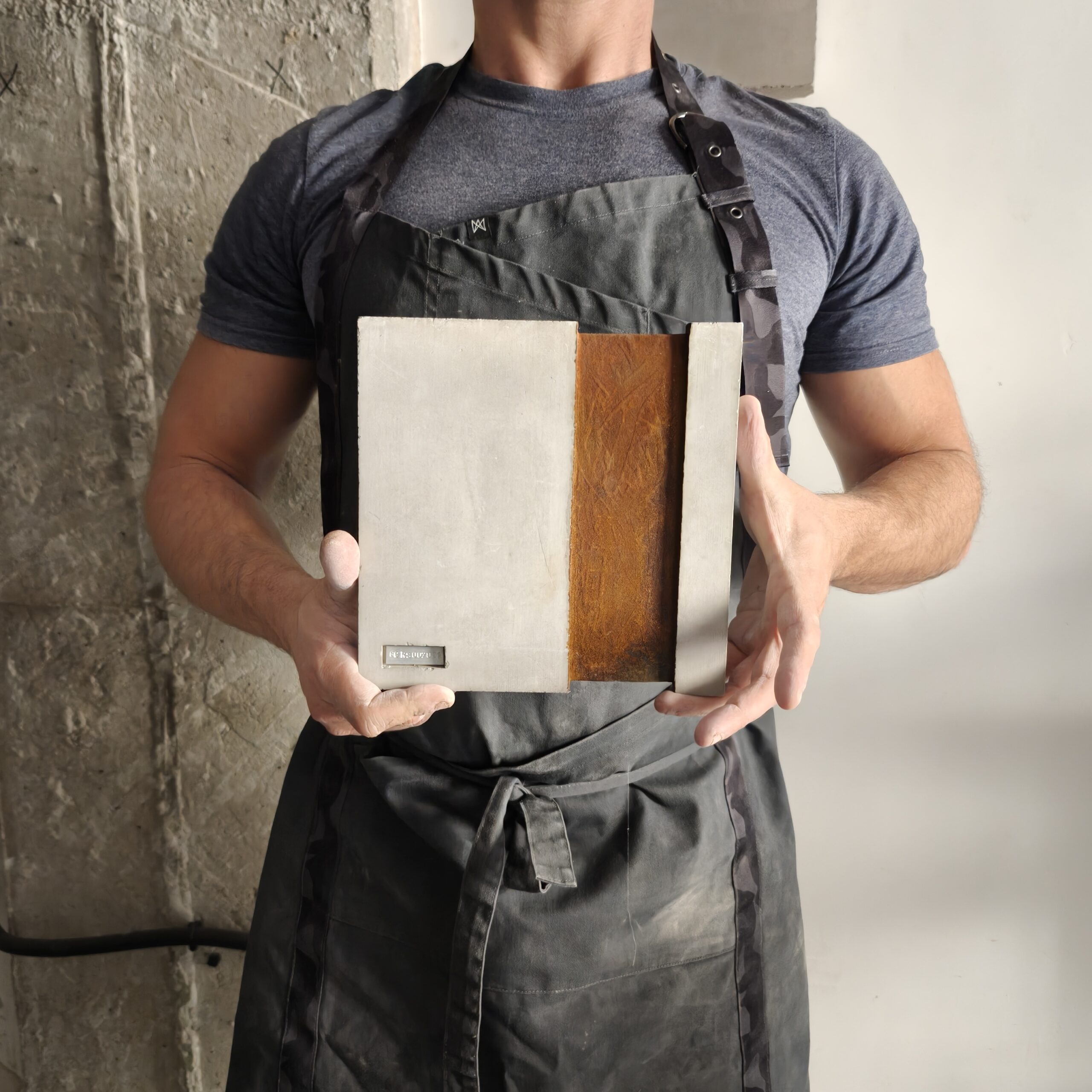 Cada unidad de este modelo atraviesa un proceso enteramente manual que comprende el fraguado, el curado, el secado y la intervención oxidativa — fases que no pueden acortarse sin comprometer el resultado.