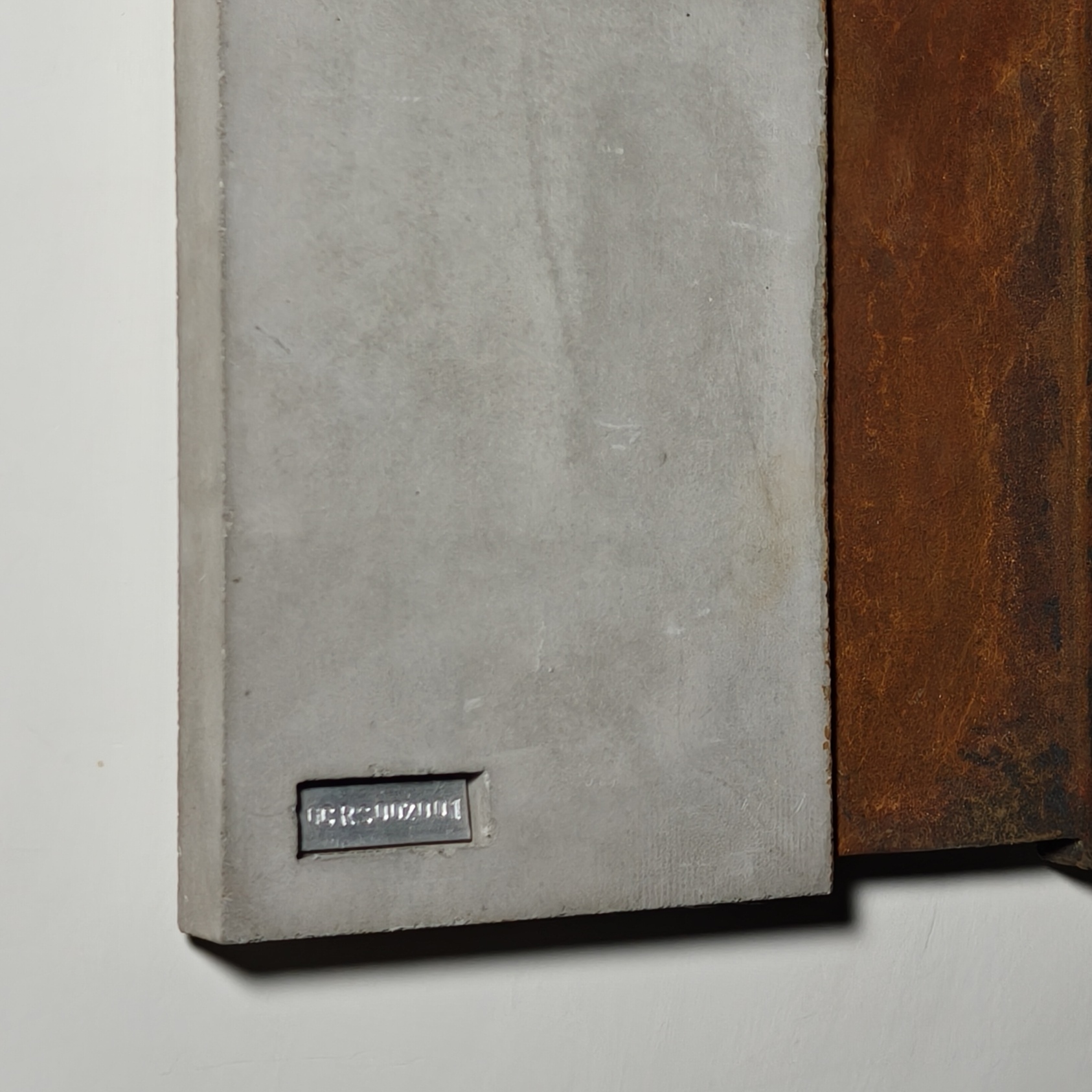 Escultura mural en hormigón tratada mediante proceso oxidativo en capas sobre el plano central de la pieza. Los dos planos laterales permanecen en hormigón crudo, generando un contraste material entre la superficie oxidada y la masa sin intervenir. La composición se articula en tres relieves de distinta profundidad.